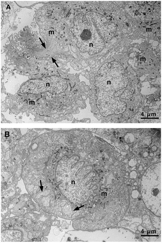 The huge number of mitochondria in CON VSMCs is also highlighted in Figure 3A. The endoplasmic reticulum was highly represented in SYN VSMCs and composed of enlarged roundish cisternae, while in CON cells, it had a more standard aspect, composed of narrow cisternae (Figure 3A). Bundles of myofibrils with dense bodies were the main features of CON VSMCs (Figure 3C,E); moreover, myofibrils were associated with mitochondria (Figure 3E). In addition, autophagic vacuoles and membrane cell protrusions (see arrows), likely pseudopods that characterize the cell surface (Figure 3F), were peculiar hallmarks for SYN VSMCs (Figure 3D). The presence of pseudopods clearly demonstrated that SYN VSMCs were migrating cells. Basal autophagy is an essential mechanism in maintaining cellular homeostasis in all cell types, allowing the recycling and clearance of damaged proteins and organelles. Deregulation of one or more steps in this process (autophagy activation, autophagosome elongation and maturation, and autolysosomal content degradation) can make a decisive contribution to the pathogenesis of several diseases, including cardiovascular pathologies [10,11,12]. Recently, several studies showed that autophagy occurs in atherosclerosis and, in VSMCs, seems to be a potentially vital mechanism to maintain the stability of advanced plaques, exerting a positive effect [29]. On the other hand, an excessive autophagy induced the phenotypic transition to the de-differentiated (i.e., pathological) state, promoting VSMC proliferation and vascular remodeling that contributed to the pathogenesis of atherosclerosis [30,31].