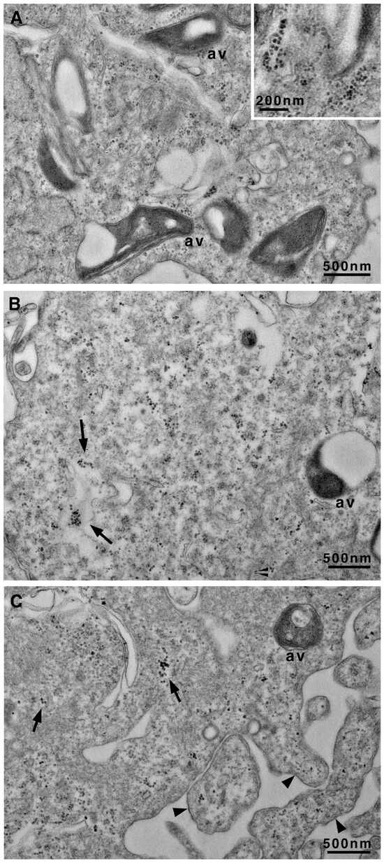 Transmission electron microscopy of VSMCs cultured in calcifying medium for 7 days. Representative images showing scattered calcium microcrystals of different sizes in the cytoplasm ((A) with insert and (B,C)). In (B,C), microcrystals are also evident inside vesicles (arrow) and in the surface protrusions (arrowhead) of the plasma membrane (C). av, autophagic vacuoles. Scale bars, 500 nm; insert, 200 nm.