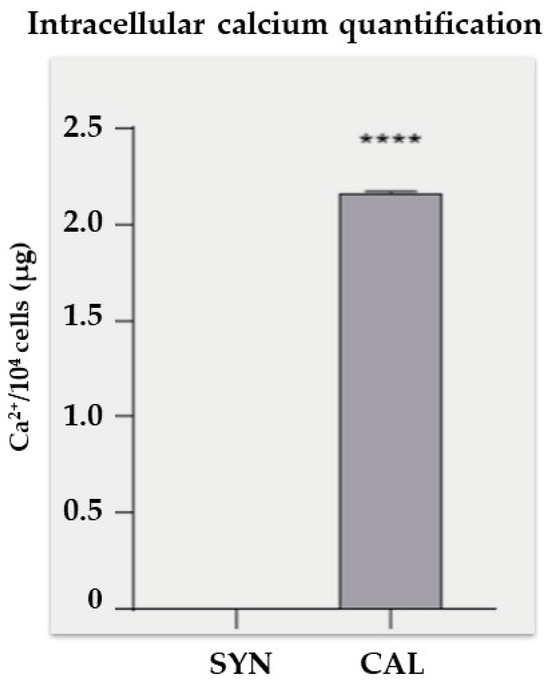 Intracellular calcium analysis performed with a colorimetric assay revealed a significant increase in calcium levels in the CAL group compared to the SYN group (Figure 5). The CAL group showed an average calcium concentration of approximately 2.1 µg per 104 cells. In contrast, the SYN group exhibited negligible calcium content, highlighting the impact of the treatment on cellular calcium accumulation.