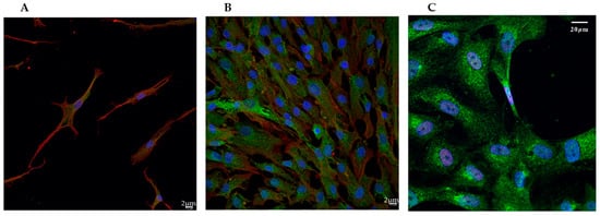 VSMCs cultured in a standard medium with 10% FBS migrate and proliferate, showing a synthetic (SYN) phenotype [26]. When cultured in a medium deprived of serum for at least 3 days, they acquire the contractile (CON) quiescent phenotype. The green, fluorescent stain with Phalloidin Alexa Fluor 488 was used to evidence the overall morphology of the cells, enabling the visualization of the global structural changes and remodeling of the actin cytoskeleton that occurs during this phenotypic switch. As shown in Figure 1, the changes evidenced by the expression of phalloidin were associated with a morphological shift from spindle-shaped (Figure 1A), typical of the contractile phenotype, to fan-shaped forms, with many focal adhesions, characteristic of moving cells, thus of the synthetic phenotype (Figure 1B). When cells were treated with a calcifying medium, their general morphology was similar to the SYN ones, and they seemed to coalesce, forming tight bundles (Figure 1C).