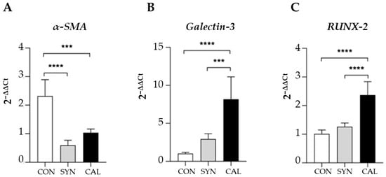 We also investigated the phenotypic changes by exploiting immunofluorescence confocal microscopy to analyze the expression of specific contractile and synthetic biomarkers such as anti-α-SMA and anti-galectin-3, a marker for the SYN phenotype (Figure 6) [20]. As anticipated, cells cultured without serum (CON) showed high α-SMA expression (Figure 6A). In contrast, compared to CON, galectin-3 expression increased significantly in both SYN (Figure 6B) and CAL (Figure 6C) groups. RUNX-2 expression, an indicator of the synthetic-osteoblastic phenotype [5,14,15], was elevated in phosphate-treated samples compared to the CON and SYN phenotypes. Real-time PCR analysis (Figure 7) confirmed the morphological results since α-SMA expression decreased in the SYN and calcification-induced group (Figure 7A). Galectin-3 (Figure 7B) showed reduced signal intensity in the CON group, whereas the calcification-exposed group exhibited a statistically significant increase. RUNX-2 expressions significantly increased in CAL groups with respect to CON and SYN (Figure 7C), demonstrating distinct pathological phenotypes.