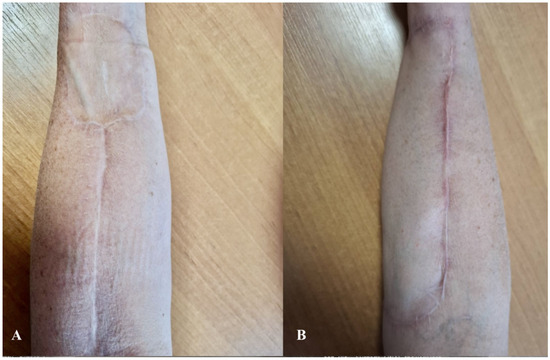 Schematic representation of aesthetic outcomes three months post-surgery using (A) the STSG technique and (B) the UBTF technique. Abbreviations: STSG—split-thickness skin graft; UBTF—ulnar-based transposition flap.