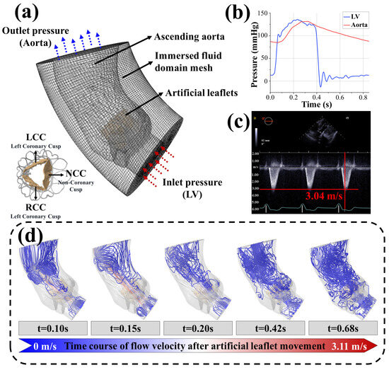 In the coupled computational model, all solid regions were fully immersed within the fluid domain and treated as static Eulerian grids (Figure 2a). Compared to the large deformations of the leaflets, the deformations of the aortic wall, surgical frame, metal stent, and skirts were negligible and, thus, were modeled as rigid bodies with all degrees of freedom fixed. Pressure loads equivalent to those obtained in the pulsatile flow experiments described in Section 2.2 were applied at the inlet and outlet of the aorta. Using pulsatile pressure helps to better simulate the behavior of valves under nonlinear dynamics [36]. The numerical model treated blood as an incompressible Newtonian fluid with an initial density equal to the compressed density. The blood density was 1.06 g/cm3 and the viscosity was 0.00365 Pa·s. The stress distribution results of the artificial leaflets obtained from the virtual surgery were used as the initial stress values for the coupled computational model, and the remaining boundary conditions were consistent with those of the virtual surgery. The analysis encompassed five cardiac cycles to eliminate errors caused by program initialization. Data from the initial cardiac cycles were discarded, and data analysis was performed on data collected during subsequent cardiac cycles. The output parameters included blood flow trajectories, flow velocities, valve leaflet morphology, and leaflet surface stresses.