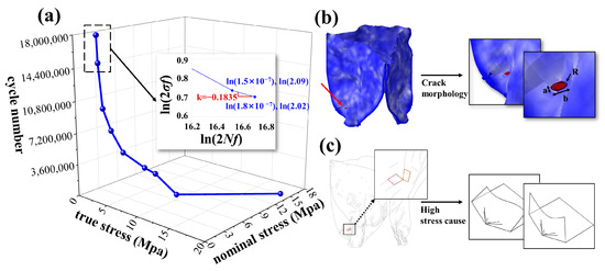 Analysis of fatigue life results: (a) The S-N curve of the artificial leaflet material, with the two horizontal axes representing true stress and nominal stress, respectively, and the vertical axis indicating the number of cycles. The Basquin curve plots the logarithms of 2 and on the horizontal and vertical axes, respectively. (b) It is hypothesized that the region of the maximum stress concentration serves as the initial site of tearing, and this area is modeled as an elliptical crack. (c) In the wireframe diagram of the artificial leaflet, it can be observed that the leaflet surface is compressed to form a sharp angle, akin to the sharp angle produced when paper is folded.