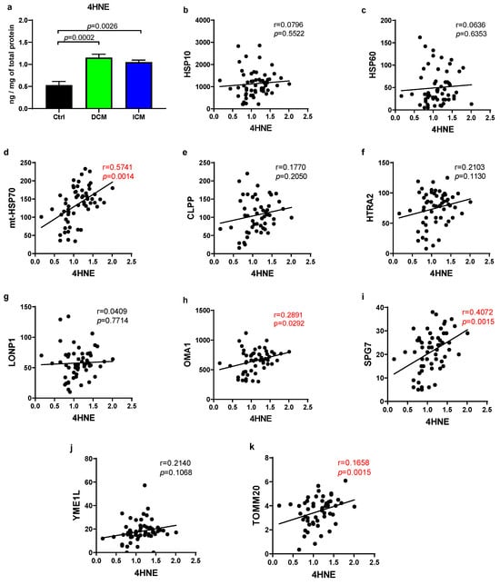 Production of ROS and UPRmt in human hearts. (a) Levels of 4-hydroxynonenal (4HNE) were quantified using an ELISA kit in samples of failing human hearts. (b–k) Scatter plots illustrating a correlation between 4HNE levels and UPRmt protein levels in failing human hearts. Pearson or Spearman coefficient correlation and p-value are given on each graph, where red color indicates a statistically significant correlation (p < 0.05). Abbreviations: Ctrl (control; n = 6); DCM (heart failure caused by dilated cardiomyopathy; n = 30); and ICM (heart failure caused by ischemic cardiomyopathy; n = 29).