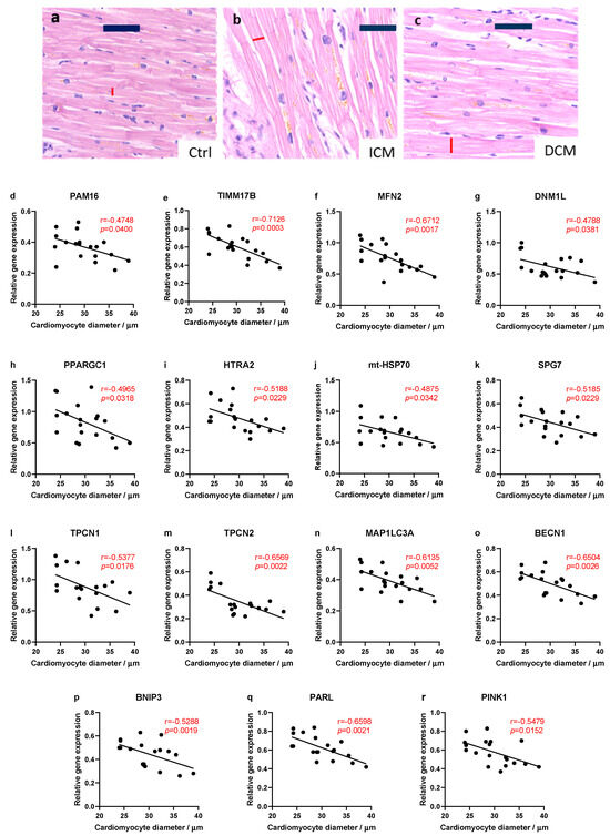 Relationship between myocardial hypertrophy and the UPRmt and MQC gene expression. (a–c) Representative images of hematoxylin and eosin (H&E)-stained sections of myocardium that were used to measure cardiomyocyte diameters in formalin-fixed paraffin-embedded slices of hearts of patients with DCM or ICM. Scale bars = 50 µm (d–r) Scatter plots illustrate the correlation between cardiomyocyte’s diameter and a relative gene expression in failing human hearts (ICM and DCM samples combined). Pearson or Spearman coefficient correlation and p-values are given on each graph, where red color indicates statistically significant difference (p < 0.05). Abbreviations: Ctrl (control; n = 6); DCM (heart failure caused by dilated cardiomyopathy; n = 30); and ICM (heart failure caused by ischemic cardiomyopathy; n = 29).