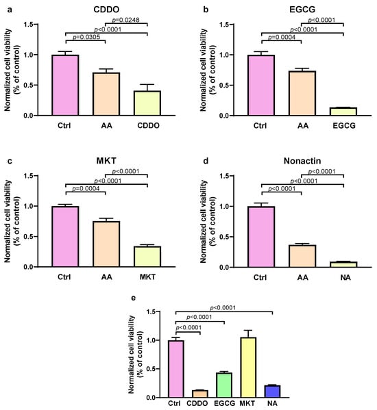 Effect of UPRmt inhibitors on human cultured cells exposed to oxidative stress. An MTT assay was used to assess viability of cells without any treatment (control, Ctrl), cells treated with antimycin A to induce oxidative stress (AA), and cells treated with combination of AA and one of four different UPRmt inhibitors: (a) EGCG (inhibitor of OMA1); (b) MKT-077 (MKT; inhibitor of mt-HSP70); (c) CDDO (inhibitor of LONP); and (d) nonactin (NA; inhibitor of HSP60). Effects of inhibitors alone, without AA are shown in (e). Data are expressed as means ± SEM with n = 8 for each group. Data are normalized to control (Ctrl). Significant p-values are indicated in graphs.