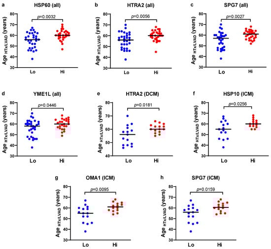 The age of patients undergoing heart transplantation or LVAD implantation according to the myocardial expression of UPRmt proteins. (a–h) Individual data points represent the age when patients underwent heart transplantation or LVAD implantation (ageHTx/LVAD), and the horizontal line indicates mean values. Patients were divided into two groups according to the myocardial expression of respective UPRmt proteins (CLPP, HSP10, HSP60, mt-HSP70, HTRA2, LONP1, OMA1, SPG7, TOMM20, and YME1L), where half of the patients with a lower expression were assigned to the low group (Lo) group, and half of the patients with a higher expression were assigned to the higher group (Hi). The patients with dilated cardiomyopathy (DCM) and ischemic cardiomyopathy (ICM) were analyzed separately or together (all). Only significant differences (p < 0.05) are shown.