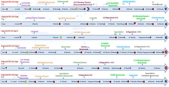 In the United States, CRC is the third most diagnosed and the third leading cause of cancer-related deaths for both men and women. However, it ranks second in cancer-related deaths overall and is the leading cause of death among men younger than 50 years. More than half of all cases and deaths can be linked to modifiable risk factors including smoking, unhealthy diet, high alcohol consumption, physical inactivity, and excess body weight. CRC stands as the second most prevalent cause of cancer-related deaths in the United States. Every three years, the American Cancer Society (ACS) releases updated statistics on CRC, extracting data on incidence from population-based cancer registries and mortality data from the National Center for Health Statistics (NCHS). In 2023, it is projected that approximately 153,020 individuals will be diagnosed with CRC, while 52,550 will die from the disease. Among those cases, 19,550 will affect individuals under the age of 50, resulting in 3750 deaths []. Among people diagnosed with mCRC, approximately 70% to 75% of patients survive beyond 1 year, 30% to 35% beyond 3 years, and fewer than 20% beyond 5 years from diagnosis. The treatment strategy for mCRC is termed resectable when the primary tumor and all metastases are amenable to complete surgical removal. However, in these patients, nodal infiltration and occult micro-metastatic dissemination are common. Resection of mCRC achieves long-term cure for less than 20% of mCRC patients []. Currently, several different drugs are being used in mCRC treatment, with first- and second-line options including the systemic drugs 5-FU, irinotecan, oxaliplatin, bevacizumab, cetuximab, panitumumab, and the oral drug capecitabine, as well as different combinations of these drugs, such as the FOLFOX regimen (5-FU, leucovorin, and oxaliplatin), the FOLFIRI regimen (5-FU, leucovorin, and irinotecan), and the XELOX regimen (capecitabine and oxaliplatin), either with or without a monoclonal antibody agent []. However, treatment options beyond the third line of refractory mCRC remain challenging, and despite the availability of multiple options, outcomes are generally poor [].