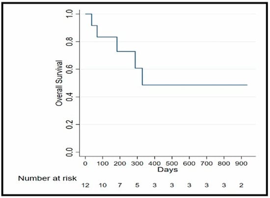 In our study, we observed that the median OS is 12 months. The 10 months OS of 61% (95% Confidence Interval (CI):25–84%) and 12 months OS of 50% (95% CI: 18.8–75.3%) OS Kaplan–Meier analysis is illustrated in Figure 2. Additionally, the median PFS was 3.15 months.