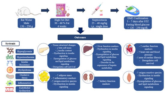 The dysregulation of the insulin signaling pathway was identified in adipose tissue, liver, and skeletal muscle [14,18,22,25], and the dysregulation of glucose and lipid metabolism signaling was observed in the pancreas, liver, and skeletal muscle [22,25,26,29,32]. There was increased expression of NF-kB in visceral fat [21] and iNOS in muscle and adipose tissue [18]. Alterations in the transcriptional control of regulatory pathways, apoptosis, and cell proliferation were pointed out in the included studies [27,31]. Figure 2 summarizes the main characteristics of DM2 induction using the HFD + STZ model and its main pathological outcomes.
