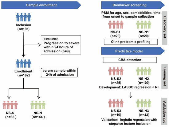 The study design included two parts (Figure 1). Firstly, to control the influence of confounding factors, we performed propensity score matching (PSM) on a 1:1 basis for age, sex, comorbidities, and time from symptom onset to sample collection between NS-N and NS-S groups of patients to establish a biomarker screening cohort. This resulted in a small sample discovery set of 20 patients per group (NS-N1 and NS-S1) who underwent proteomic profiling to screen for DEPs between the groups. Subsequently, protein quantification of DEPs was conducted on a predictive model cohort including 178 patients (4 excluded because they lacked sufficient serum volume for CBA detection). The cohort was randomly divided into a 70% training set (NS-N2: 100 cases; NS-S2: 25 cases) for model development and a 30% validation set (NS-N3: 43 cases; NS-S3: 10 cases) for predictive performance validation.