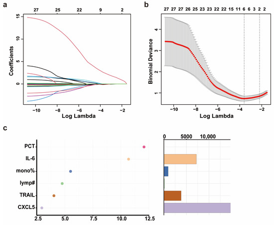 Through the analysis of the propensity score-matched biomarker screening cohort, we identified Flt3L, TRAIL, CXCL5, IL-12B, MCP-3, IL-24, and IL-8 as candidate biomarkers for severe progression of COVID-19 in elderly patients. Subsequently, we quantified the levels of the seven DEPs in the serum of 178 patients (predictive model cohort) using CBA (Supplementary Table S2). Prior to predictive model development, we addressed missing data for PCT and CRP through MCMC multiple imputation. In the training set (NS-N2: 100 cases; NS-S2: 25 cases), we included variables such as age, sex, comorbidities, days from symptom onset to sample collection, WBC, neutrophil percentage, neutrophil count, lymphocyte percentage, lymphocyte count, monocyte percentage, PCT, CRP, IL-6, Flt3L, IL-8, IL-12B, TRAIL, CXCL5, IL-24, and MCP3. LASSO regression was used to filter features. The optimal regularization parameter λ for LASSO regression was 0.027, which retained six features according to lambda min while compressing the coefficients of the remaining features to zero (Figure 3a,b). To address potential overfitting (limited remaining features and small sample size of NS-S2 and NS-S3), we employed a two-step approach: (1) random forest-based feature importance ranking, followed by (2) logistic regression with incremental feature addition (for β coefficient of each biomarker, see Supplementary Table S3). In the validation set, model robustness was assessed by stepwise ROC curve analysis.