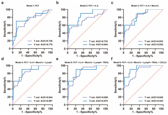 ROC analysis of training set and validation set for the severity progression of COVID-19. (a–f) The stepwise ROC curves plotted in the training and validation sets according to the importance ranking of features. The ROC curves for (a) PCT; (b) PCT + IL-6; (c) PCT + IL-6 + monocyte percentage; (d) PCT + IL-6 + monocyte percentage + lymphocyte count; (e) PCT + IL-6 + monocyte percentage + lymphocyte count + TRAIL; (f) PCT + IL-6 + monocyte percentage + lymphocyte count + TRAIL + CXCL5. All ROC curves were plotted with the red dashed diagonal line (AUC = 0.5) as reference. Note: T set means training set, V set means validation set, mono% means monocyte percentage, and lymp# means lymphocyte count.