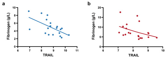 Correlation analysis between TRAIL and fibrinogen. (a) Pearson correlation analysis between Olink-detected TRAIL and fibrinogen in NS-N1 group (r = −0.603, p = 0.005). The blue line represents linear regression (R square = 0.363). (b) Spearman correlation analysis between Olink-detected TRAIL and fibrinogen in the NS-S1 group (ρ = −0.555, p = 0.011). The red line represents a smoothing spline fit (knots = 5) to illustrate the trend.