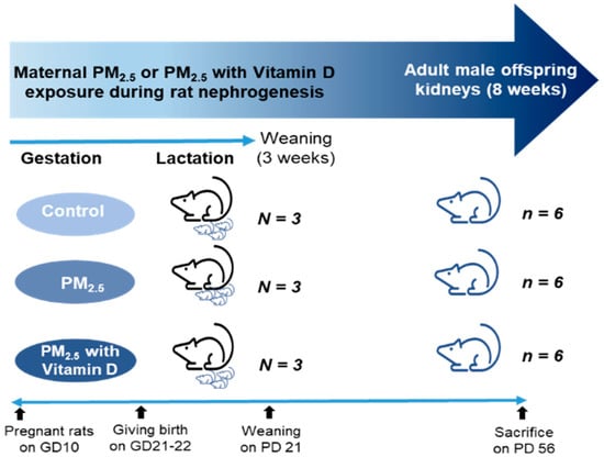 For the animal studies, nine pregnant Sprague–Dawley rats on gestation day 10 (Raonbio, Yong-in, South Korea) were kept under standard conditions. All pregnant rats were allowed natural birth, with pups being born on days 21–22 of gestation. The pregnant rats were randomly divided into three groups: control, PM2.5, and PM2.5 with vitamin D (PV) groups (N = 3 in each group). They received either NS (70 μL, 5 times/week), PM2.5 (70 μL dissolved in saline, 5 times/week), or PM2.5 (70 μL dissolved in saline, 5 times/week) with vitamin D (cholecalciferol, 1000 IU/kg, 3 times/week; FND Net Co., Seoul, South Korea) via an orogastric tube from gestation day 11 to lactation day 21. The pups were weaned on postnatal day 21 and remained without intervention until postnatal day 56. The body weights of male offspring rats were measured every 3 to 7 days. Male adult offspring (n = 6 per each dam group) were euthanized on postnatal day 56. Given that many studies demonstrate male offspring are particularly susceptible to fetal insults during critical developmental windows [], only male offspring rats were utilized in our experiments. The adult male offspring rats were anesthetized with 2% isoflurane, and blood was drawn to assess levels of calcium (Ca2+), 25-hydroxyvitamin D [25(OH)D], and cystatin C via cardiac puncture. Their kidneys were then extracted for Western blot analysis (right kidneys) and histological and immunohistochemical evaluations (left kidneys). The experimental design is illustrated as follows (Figure 1).