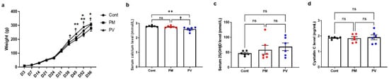 Offspring body weights and biochemical analysis: (a) Changes in body weight up to postnatal day 56. (b) Serum calcium levels. (c) Serum 25(OH)D concentrations. (d) Serum cystatin C levels on postnatal day 56 in offspring rats. * p < 0.05, Cont vs. PM; ** p < 0.05, Cont vs. PV; † p < 0.05, PM vs. PV (n = 6/group). Cont, control group; PM, PM group; PV, PV group; ns, not significant.