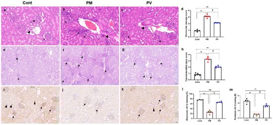 Renal histological changes and capillary density in adult offspring kidneys: (a–c) H&E staining. (d) Glomerular damage scores. (e–g) PAS staining. (h) Tubulointerstitial injury scores. (i–k) JG-12 immunostaining images. (l) Quantification of glomerular JG-12 immunostaining. (m) Quantification of peritubular JG-12 immunostaining. Adult offspring exposed to maternal PM2.5 showed glomerular, tubulointerstitial, and vascular changes ((b,f) arrows, glomerular retraction and tubulointerstitial infiltrates; arrowhead, abnormal vascular morphology with wall thickening) compared to control kidneys ((a,e) arrows, glomeruli; arrowhead, vessel). Maternal vitamin D supplementation attenuated these renal structural alterations in offspring rats ((c,g) arrows, abnormal glomeruli and tubules; arrowhead, mildly thickened vessel). While glomerular (arrows) and peritubular (arrowheads) capillary endothelial cells were well preserved in control rats (i), capillary rarefaction (arrows) was pronounced in the maternal PM2.5-exposed offspring kidneys (j). Maternal vitamin D supplementation reduced the loss of glomerular (arrows) and peritubular (arrowheads) capillaries (k) in adult offspring kidneys. * p < 0.05, Cont vs. PM; ** p < 0.05, Cont vs. PV; † p < 0.05, PM vs. PV ((a–c) and (i–k) 400×, bar = 20 µm; (e-g) 200×, bar = 50 µm) (n = 4–5/group). Cont, control group; PM, PM group; PV, PV group; ns, not significant.