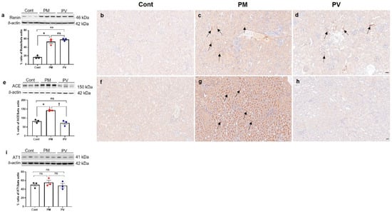 Intrarenal RAS signaling in adult offspring kidneys: (a–d) renin. (e–h) ACE. (i) AT1. Western blot analysis showed increased renin (a) and ACE (e) activities in the kidneys of offspring rats exposed to maternal PM2.5 compared to controls. Maternal vitamin D supplementation significantly reduced intrarenal ACE activity (e). Immunohistochemically, renin expression was observed in the interstitium and juxtaglomerular cells of offspring kidneys from the PM ((c), arrows) and PV groups ((d), arrows), whereas it was rarely detected in control offspring kidneys (b). ACE was also expressed extensively throughout the brush border of tubular cells in kidneys of offspring exposed to maternal PM2.5 ((g), arrows). Maternal vitamin D supplementation markedly reduced intrarenal ACE expression in the adult offspring rats (h). No differences were observed in intrarenal AT1 activity among the groups (i) (* p < 0.05, Cont vs. PM; ** p < 0.05, Cont vs. PV; † p < 0.05, PM vs. PV) (200×, bar = 50 µm) (n = 3–6/group). Cont, control group; PM, PM group; PV, PV group; ns, not significant.