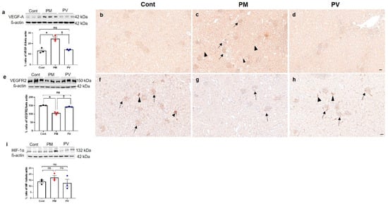 Intrarenal VEGF-A, VEGFR2, and HIF-1α expressions in adult offspring kidneys: (a–d) VEGF-A. (e–h) VEGFR2. (i) HIF-1α. Western blot analysis revealed an increase in VEGF-A (a) and a decrease in VEGFR2 (e) activity in maternal PM2.5-exposed offspring’s kidneys compared to the controls, which was reversed by maternal vitamin D treatment. Intrarenal VEGF-A expression was strongly detected throughout almost all tubular segments and glomeruli in the PM2.5 group ((c), arrows, glomeruli; arrowheads, tubules), compared to the controls (b) and the PV group (d). While VEGFR2 expression was prominently observed in glomeruli and peritubular capillaries in control kidneys ((f), arrows, glomeruli; arrowheads, peritubular capillaries and interstitium), it was weakly detected in offspring kidneys from maternal PM2.5 exposure ((g), arrows, glomeruli). Maternal vitamin D intake restored VEGFR2 expression in glomeruli and interstitium ((h), arrows, glomeruli; arrowheads, peritubular capillaries and interstitium). Intrarenal activity of HIF-1α was not different among the groups (i) (* p < 0.05, Cont vs. PM; † p < 0.05, PM vs. PV) (200×, bar = 50 µm) (n = 3–6/group). Cont, control group; PM, PM group; PV, PV group; ns, not significant.