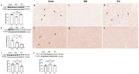 Intrarenal Angs, Tie-2, and TSP-1 expressions in adult offspring kidneys: (a–d) Ang-1. (e–h) Tie-2. (i) Ang-2. (j) TSP-1. Western blot analysis showed reductions in Ang-1 (a) and Tie-2 (e) activities in kidneys of offspring exposed to maternal PM2.5 compared to controls. Maternal vitamin D intake restored Ang-1 expression in the offspring’s kidneys. Immunohistochemically, Ang-1 (b) and Tie-2 (f) expressions were clearly observed in tubular cells in the controls (arrows). However, they were rarely detected in offspring kidneys exposed to maternal PM2.5 (c,g). Intrarenal activity of Ang-1 in offspring kidneys increased with maternal vitamin D supplementation ((d), arrows, tubular cells). There were no differences in intrarenal activities of Ang-2 (i) and TSP-1 (j) among the groups (* p < 0.05, Cont vs. PM; ** p < 0.05, Cont vs. PV; † p < 0.05, PM vs. PV) (200×, bar = 50 µm) (n = 3–6/group). Cont, control group; PM, PM group; PV, PV group; ns, not significant.