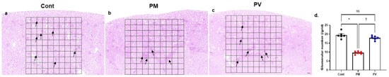 Representative photomicrographs and glomerular counts from kidney sections: (a–c) PAS staining. (a) control group, (b) PM2.5-exposed group, (c) PV group, and (d) glomerular number per grid. Glomeruli were counted only if they were fully enclosed within a 10 × 10 grid in the cortical region. Offspring exposed to PM2.5 exhibited a significantly reduced number of glomeruli per grid, which was ameliorated by maternal vitamin D supplementation (n = 6 kidneys × 4 sections × 10 fields for each group) (* p < 0.05, Cont vs. PM; † p < 0.05, PM vs. PV) (100×, bar = 100 µm). Cont, control group; PM, PM group; PV, PV group; ns, not significant.
