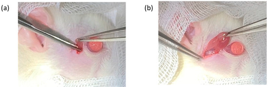 The rats were given 2 mg/kg of oral meloxicam (Mobic® Tablets 7.5 mg, Boehringer Ingelheim Ellas A.E., Attica, Greece) and 25 mg/kg of oral amoxicillin (amoxicillin capsules 500 mg, China Chemical & Pharmaceutical Co., Ltd., Taipei, Taiwan) about 1 h prior to the surgery. At the same time, post-operative care with oral medication, including oral meloxicam (1 mg/kg, SID for 2 days, starting from the day after surgery) and amoxicillin (25 mg/kg, BID for 5 days) was administered to all rats. The rats were anesthetized with intraperitoneal 20 mg/kg tiletamine hydrochloride and zolazepam hydrochloride (Zoletil®, 500 mg/5 mL, Virbac AH, Inc., Carros, France) in combination with 10 mg/kg Xylazine hydrochloride. Unilateral right infra-orbital and extra-orbital lacrimal gland excisions were performed while the left lacrimal glands were left intact in all groups [31]. In brief, a skin incision was made 2 mm away from the lateral canthus to expose the ILG, which was excised using ophthalmic forceps and tenotomy scissors. The subcutaneous tissue layer was then excised and extended caudally toward the cranioventral part of the ear, exposing the ELG, which was excised. 4-0 Nylon sutures were used to close the surgical incision (Figure 1).