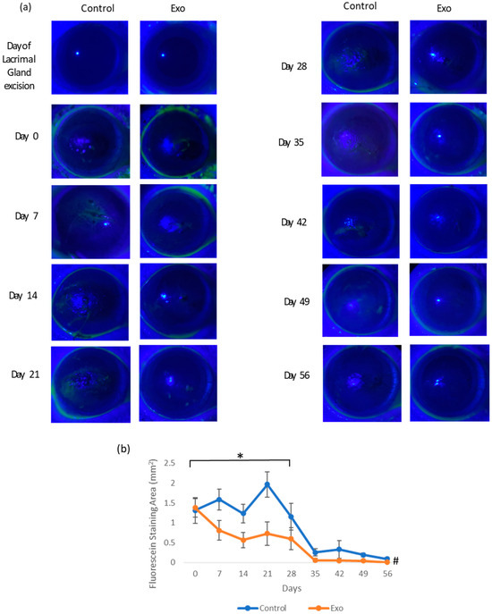 Corneal fluorescein staining. (a) Photographic images of corneal fluorescein staining of each group from day of lacrimal gland resection to day 56. The Exo group had minimal staining since day 21 compared to the control group, where the cornea surface was uneven and stained at least till day 35. (b) Corneal fluorescein staining area (mm2) throughout the 56-day study (* group effects, p = 0.032, # days effects, p = 0.002).