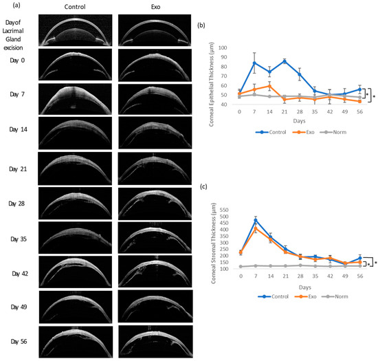 Corneal epithelium and stromal thickness examination and analysis throughout 56 days. (a) OCT images of the cornea. Both groups had stromal thickening by day 7 and slowly subsided throughout this study. The control group had focal areas of thickening at the epithelial layer. (b) Epithelium thickness (µm) between groups. * Group effects, p = 0.003. (c) Stromal thickness (µm) between groups. * Group effects, p < 0.001.