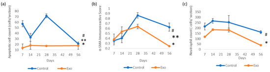 Immunoreactivity scores (IRSs) of (a) apoptotic cells (TUNEL assay) (* group effects, p < 0.001, # days effects, p < 0.001, ** groups × days interaction, p < 0.001); (b) α-SMA immunohistochemistry staining (* groups effects, p = 0.04, # days effects, p < 0.001, ** days × groups interaction effects, p = 0.008); and (c) neutrophil count with H&E staining analysis (* group effects, p < 0.001, # days effects, p < 0.001).