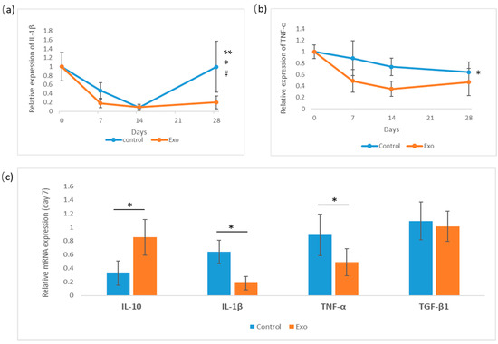 Relative gene expression of cytokines IL-1β, TNF-α analysis for 28 days, and day-7 measurements of IL-10, IL-1β, TNF-α, and TGF-β1. (a) Relative gene expression of IL-1β (* group effects, p = 0.003, # days effects, p = 0.003, ** days × groups interaction effects, p = 0.018). (b) Relative expression of TNF-α (* group effects, p = 0.001). (c) Day-7 analysis of cytokines (IL-10 * p = 0.025).