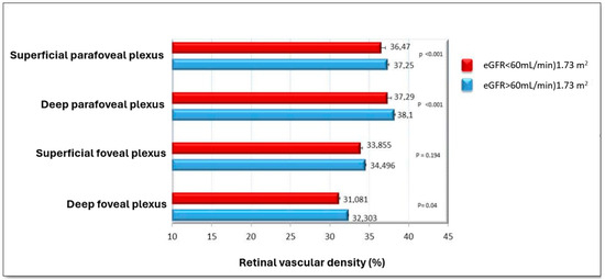 Comparison of retinal vascular density (%) in different retinal plexuses between patients with eGFR < 60 mL/min/1.73 m2 (red) and eGFR > 60 mL/min/1.73 m2 (blue).