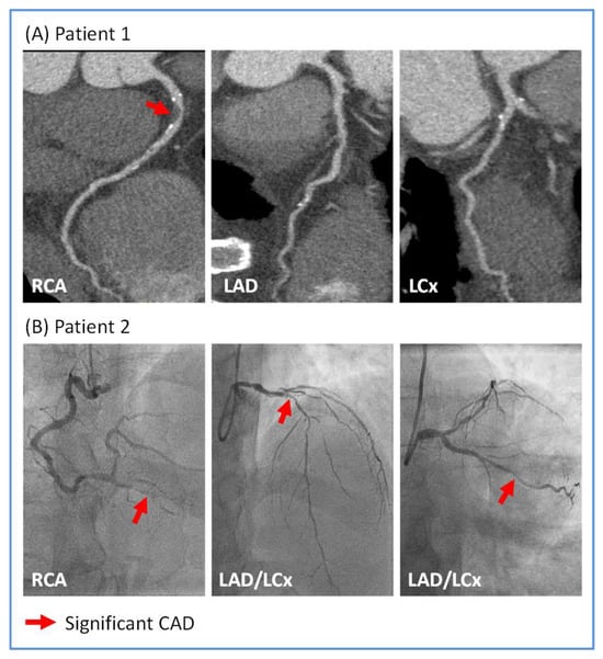 Illustrative images of significant coronary artery disease (CAD) in sepsis survivors. (A) Patient 1 underwent computed tomography coronary angiography which showed severe (>70%) stenosis in the proximal right coronary artery (RCA; red arrow) and unobstructed left anterior descending (LAD) and left circumflex (LCx) arteries. (B) Patient 2 underwent invasive coronary angiography which showed severe stenoses in the distal RCA, the proximal LAD and mid LCx arteries (all indicated by red arrows).