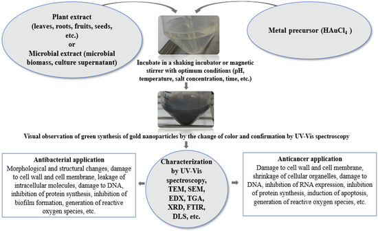As we delve deeper into green-synthesized nanoparticles, it becomes increasingly evident that their potential extends far beyond conventional therapeutic approaches. The amalgamation of eco-friendly synthesis methods with nanoparticle technology offers a sustainable path forward, harnessing the power of nature to tackle some of the most pressing challenges in modern medicine. This exploration into the anticancer and antimicrobial applications of green-synthesized nanoparticles promises to reshape the medical landscape, offering hope for more effective, efficient, and environmentally conscious treatment strategies. Among various metal nanoparticles, AuNPs have received a lot of attention due to their wide scope of application in different branches of biomedical science [5,7,34,35]. Many reports suggest applying AuNPs as antibacterial and anticancer agents to control drug-resistant pathogenic microorganisms and cancer cells, respectively [5,7,12,36]. Because of their strong antimicrobial and anticancer efficacies, there is prominent research interest in AuNPs for developing novel, safe, and effective antimicrobial and anticancer agents. Figure 1 shows the schematic representation of the green synthesis, characterization and potential antibacterial and anticancer applications of AuNPs.