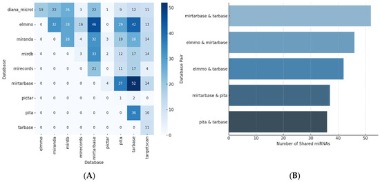 Figure 1. Results consonance through the prediction and validation of miRNA databases. (A) Shared miRNA results across databases. (B) Top 5 database interactions based on shared miRNA predictions.