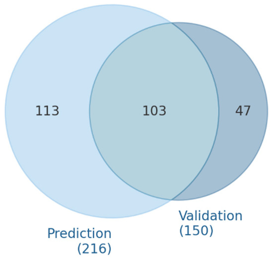 The prediction evaluation identified 216 miRNAs targeting VEGFA, while 150 experimentally validated gene–miRNA interactions were noted (Table S3). From these evaluations, 103 miRNAs were both predicted and validated (Figure 2).