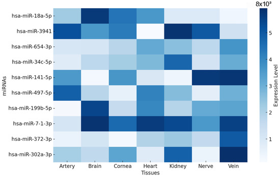 The raw data standard tissue mean expression from the miRNA TissueAtlas 2025 version 3 (https://ccb-compute2.cs.uni-saarland.de/mirnatissueatlas_2025, accessed on 11 February 2025) was used to profile miRNA tissue expression. The selected tissues were artery, brain, cornea, heart, kidney, nerve, and vein under healthy conditions (the only available data in the database) [21]. These tissues were chosen as a reference for understanding potential dysregulation in disease contexts. Data mining was performed using Python Version 3 with the Pandas library 2.2.3 for data manipulation and aggregation [22,23]. Expression values were grouped by tissue type, and mean RPMM values were retained.