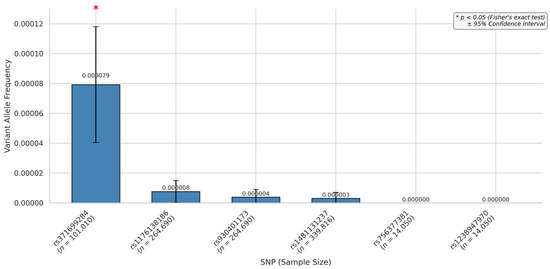 The DbSNP Build 157 (https://www.ncbi.nlm.nih.gov/snp, accessed on 17 February 2025) database was accessed and manually curated for the miRNA SNP allele changes and frequency distribution in the global population. Thus, the most frequent allele and its continental representation were selected based on the tool-available studies [26]. Fisher’s exact test was applied using estimated allele counts derived from reported frequencies in genomic databases. The Bonferroni test was conducted to correct for multiple comparisons. Confidence intervals of 95% were utilized. Statistical significance was set at p < 0.05, following standard practice in population-based genomic studies [27]. The statistical evaluations were performed in Python environment version 3, along with the Pandas version 2.2.3 library, NumPy version 2.2.4 package, Matplotlib version 3.8.4, and Seaborn version 0.13.2 [22,23,25,28,29].