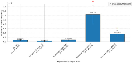 The evaluation of the frequency demonstrated statistical significance only for the American and European continents regarding the variant rs371699284 (Figure 5). Global variants also did not show significance. Most dataset studies did not present data for the variant; continents like Africa, America, and Asia had little representation in most datasets (Table S6). The alternative allele representativity for America was observed only in the gnomAD genomes and the exome. In contrast, Europe had representativity across all datasets.