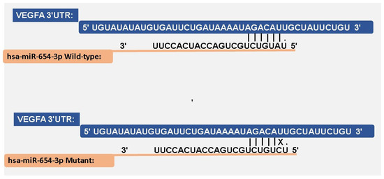 The interaction between the wild sequence hsa-miR-654-3p and the VEGFA gene is described in studies with positive validation in a HITS-CLIP (high-throughput sequencing of RNA isolated by crosslinking immunoprecipitation) experiment. In this study, the interaction led to the downregulation of VEGFA expression. HITS-CLIP experiments are well known for their accuracy in identifying direct miRNA–mRNA interactions, providing high-confidence evidence of binding sites and regulatory effects at the transcriptome level [58,59].