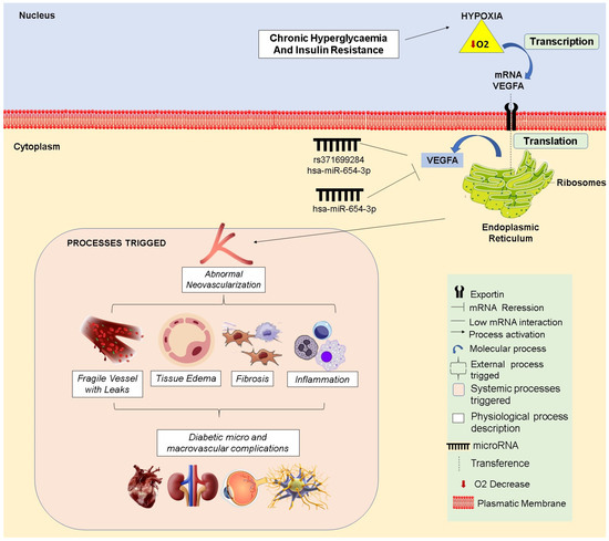VEGFA is associated with several vascular disorders, with an emphasis on diabetic conditions. This gene enhances neovascularization and vascular permeability; however, its overexpression can produce deleterious effects when the angiogenesis process is incomplete or unbalanced [64,65]. Such events can be triggered by hypoxic effects resulting from hyperglycemia and insulin resistance [66,67,68]. Additionally, oxidative stress associated with diabetic conditions exacerbates the detrimental effects of VEGFA, leading to abnormal neovascularization and resulting in fragile vessels, leakage, edema, fibrosis, and inflammation [69,70].
