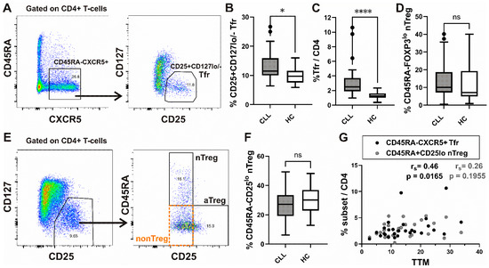 Next, Treg analysis was performed by using the strategy introduced by Miyara et al. [30], allowing for functional delineation of FOXP3/CD25 high-expressing CD45RA−FOXP3hi/CD25hi activated Treg (aTreg) subset and the two FOXP3/CD25 low-expressing subsets: CD45RA+FOXP3lo/CD25lo resting or naïve Treg (nTreg), and the CD45RA−FOXP3lo/CD25lo (non-Treg) subset (Figure 1E and Supplementary Figure S1A). When we analyzed the expression of C-X-C chemokine receptor type 5 (CXCR5), which drives T follicular regulatory (Tfr)-like features in Treg cells [37], we found a significant increase in CXCR5+ cells among non-Treg and nTreg, as well as the aTreg subset, compared to HC. The highest percentage of CXCR5+ cells was found in the nTreg subset from both CLL patients and HC (Supplementary Figure S1B). However, the percentage of the latter subset defined as either CD45RA+CD25lo or CD45RA+FOXP3lo cells among CD4+ T-cells was not significantly different between CLL patients and HC (Figure 1D,F). When Treg cells were defined as CD25+CD127lo/− (Figure 1E, left) cells, their percentage among CD4+ T-cells from our patients with CLL was significantly correlated with the percentage of both Treg subsets combined (aTregs plus nTregs) (Supplementary Figure S1C).