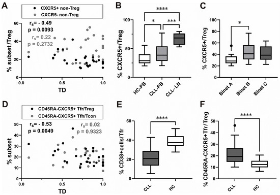 Association of CXCR5+ subsets of Treg cells with tumor mass distribution (TD), Binet staging, and decrease in CD38+ subset among CD45RA-CXCR5+ Tfr cells from patients with CLL. (A) Correlation between TD values and percentage of CXCR5+ non-Treg among CD4+ T-cells (black symbols, n = 27) and CXCR5− non-Treg among CD4+ T-cells (gray symbols, n = 27). (B) Box-and-whisker plot shows the percentage of CXCR5+ cells among gated CD25+ CD127lo/− Treg-cells in peripheral blood from patients with CLL (n = 34) and healthy controls (n = 20) (C) The percentage of CXCR5+ cells among gated CD25+ CD127lo/− Treg-cells in peripheral blood from CLL patients with Binet stage A (n = 10), Binet stage B (n = 10), and Binet stage C (n = 14) disease. (D) Correlation between TD values and percentage of CXCR5+CD45RA− Tfr among CD25+CD127lo/− Treg (black symbols, n = 27) and percentage of CXCR5+CD45RA− Tfh among CD25−CD127+ Tcon (gray symbols, n = 27). (E) The percentage of CD38+ cells among gated CD45RA-CXCR5+CD25+ CD127lo/− Tfr-cells in peripheral blood from patients with CLL (n = 25) and healthy controls (n = 20). (F) The percentage of CD45RA−CXCR5+ Tfr cells among gated CD25+ CD127lo/− Treg-cells in peripheral blood from patients with CLL (n = 28) and healthy controls (n = 20). rs, Spearman correlation coefficient; ns, not significant; * p < 0.05, *** p < 0.001, **** p < 0.0001.