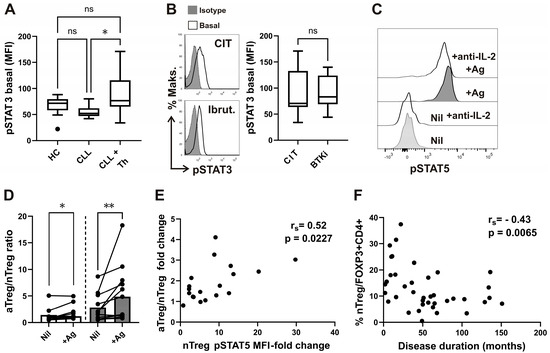 Elevated basal pSTAT3 levels in CD4+ T-cells of CLL patients undergoing therapy and correlation of disease duration with percentage of nTreg subset. (A) Box-and-whisker plot shows basal pSTAT3 levels (MFI) in CD4+ T-cells from samples of untreated patients with CLL (CLL, n = 16), patients with CLL on CIT or therapy with BTKi (CLL+Th, n = 22), and HCs (n = 15). (B) Representative histograms of pSTAT3 in gated CD4+ T-cells from sample of patients with CLL on CIT and patients with CLL on therapy with BTKi-Ibrutinib are shown left: basal, untreated cells are compared with cells stained with isotype control. pSTAT3 levels (MFI) in CD4+ T-cells from samples of patients with CLL on CIT (CIT, n = 12) and therapy with BTKi (BTKi, n = 10). (C) pSTAT5 levels in whole blood samples were collected and incubated/stimulated in tubes from Quantiferon SARS-CoV-2 kit for 16–24 h, as described in the Materials and Methods. Representative histograms of pSTAT5 in gated CD25+FOXP3+CD4+ T-cells from the same healthy donor whole-blood aliquots withdrawn from negative control (Nil) and from the two Ag tubes mixed together (+Ag), incubated with anti-IL2 neutralizing antibodies or left untreated, are shown. (D) aTreg/nTreg ratio in whole-blood aliquots withdrawn from negative control (Nil) and from the Ag tubes (+Ag). Symbols represent samples from healthy donors (white bars) and patients with CLL (gray bars). (E) Correlation between pSTAT5 MFI fold change (pSTAT5 MFI in stimulated tube divided by pSTAT5 MFI in control tube) and the increase in fold change in aTreg/nTreg ratio. (F) Correlation between percentage of nTreg among CD4+FOXP3+ T-cells from patients and disease duration (n = 39). rs, Spearman correlation coefficient; ** p = 0.001–0.01; * p < 0.05.