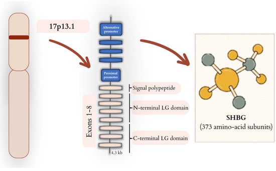 SHBG—from gene to protein. SHBG gene is located on the short arm of chromosome 17 (17p13.1). In the liver, SHBG expression is regulated by the proximal promoter that induces the transcription of mRNA composed of eight exons. The transcription process of individual exons leads to the synthesis of SHBG protein, which comprises a signal polypeptide, an N-terminal LG domain, and a C-terminal LG domain, which are built from 373 amino-acid subunits. SHBG expression in testis cells is dependent on an alternative promoter.