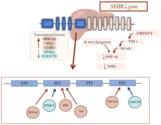 Factors affecting SHBG gene transcription. Transcriptional Factors: HNF-4α, Erα, and CAR cause an increased hepatic synthesis of the major SHBG fraction. PPARγ and COUP-TF lead to a decrease in gene expression and hepatic SHBG production. The gene for SHBG has a proximal promoter which has two trace regions (FP1 and FP3). FP1 bound COUP-TF and HNF-4α, which compete with each other for binding sites. FP3 bound HNF-4α, Erα, CAR, and PPARγ. Moreover, de novo lipogenesis and cytokine profile in obese patients decrease in HNF-4α, leading to decrease in SHBG. SHBG—sex hormone binding globulin; HNF-4α—hepatocyte nuclear factor 4 alpha; ERα—Estrogen Receptor α; CAR—constitutive androstane receptor; PPARγ—peroxisome proliferator-activated receptor gamma; COUP-TF—chicken ovalbumin upstream promoter transcription factor; TNF-α—tumor necrosis factor alpha; NF-κβ—nuclear factor-kappa B.