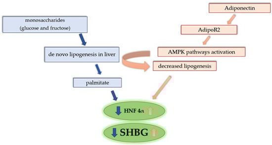 Correlation between de novo lipogenesis, adiponectin, and SHBG level. Increased intake of monosaccharides enhances de novo lipogenesis. Process of lipogenesis leads to an increased cellular concentration of palmitate, which results in downregulation of HNF-4α and indirectly decreased SHBG. Adiponectin acts through the activation of special receptors AdipoR2 in the liver, which results in AMPK pathways and influences the decreased process of de novo lipogenesis. Activation of AMPK pathways also increases oxidation of fatty acids in hepatic cells, resulting in decreased levels of lipids in hepatocytes. The influence of adiponectin on lipid metabolism increases HNF-4α, which enhances SHBG transcription.