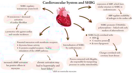 SHBG acts not only as a transporter of hormones but also regulates their levels in individual tissues [51]. Schock et al. established that cardiac cells present expression of androgen-binding protein (ABP), which has a similar structure to SHBG. The above study evaluated myocardial biopsy material taken from a group of male patients with dilated cardiomyopathy. The results of this study indicate that ABP regulates the availability of androgen in the cardiac muscle [52].