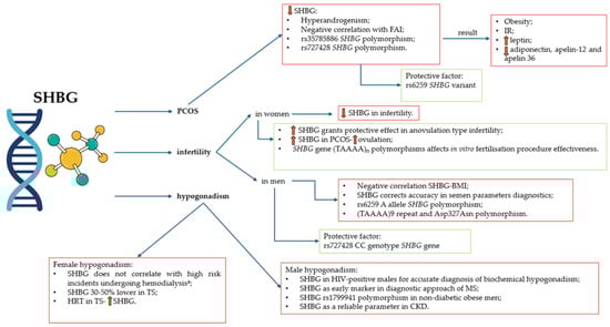 Specifically, the research concerning women’s hypogonadism and SHBG is poorly studied. Nevertheless, interesting facts are known about how the SHBG concentration may relate to hypogonadism in females. Similarly to men, women undergoing hemodialysis are found to develop hypogonadism in the end-stage kidney disease. However, in contrast to males in this state, women’s SHBG concentration does not correlate with a high risk of death or cardiovascular event [106]. An interesting study involving Turner syndrome (TS) women was conducted to evaluate differences between TS women treated with hormone replacement therapy (HRT) and the non-treated group [107]. Overall, TS women are found to possess 30–50% lower SHBG concentration in comparison to healthy controls (non-TS), and no difference was found relating to the HRT usage. TS women with ongoing HRT had higher SHBG levels than TS non-HRT women and a decrease in androgen concentrations [107].