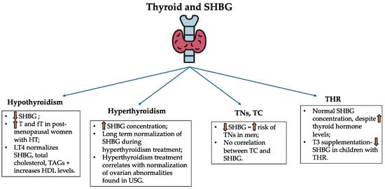 Thyroid function is closely related to sex hormone production. SHBG has become the interest of recent research. The SHBG concentration may be regulated indirectly by thyroid hormones’ effect on metabolism [28]. The link between SHBG and thyroid hormones is found in the liver and is known as HNF-4α. Thyroid hormones account for increased levels of HNF-4α, responsible for the promotion of the SHBG gene and its higher transcriptional activity, leading to increased production of SHBG [28]. Another study proves the effect of D-thyroxine on the increase in SHBG concentration. Interestingly, the dosage of 4 mg of D-thyroxine resulted in elevated SHBG levels. Women are found to be more affected by higher SHBG concentrations in comparison to men [122]. What is more, triiodothyronine (T3) significantly increases the SHBG levels as well [123,124]. One study compared the effect of regular tablet levothyroxine and liquid levothyroxine of ethanol-free formula in patients with hypothyroidism (both primary and central) [125]. Interestingly, in case of the liquid levothyroxine the SHBG concentration increased in both groups of hypothyroid patients. What is more, low-density lipoprotein (LDL) concentration decreased. This fact indicates a better response to the treatment and positive effects of the usage of liquid levothyroxine [125]. A recent study aimed to demonstrate the validity of twice-daily treatment with liothyronine and levothyroxine in patients after total thyroidectomy. According to results, no significant changes in SHBG were noticed in comparison to the control group (only levothyroxine in the morning) [126]. The Mendelian randomization study conducted by Kjaergaard et al. confirmed above mentioned correlation between thyroid hormones and sex hormones, including SHBG [127].